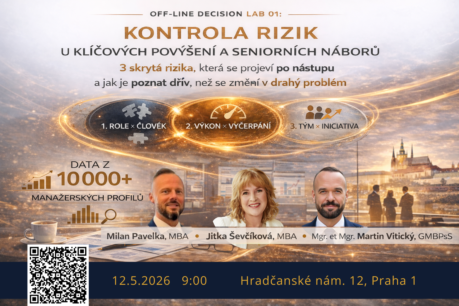 Nejdražší personální omyly totiž nevznikají v krizi. Vznikají ve chvíli, kdy „vše vypadá v pořádku“ – výkon je v normě, adaptace probíhá, tým funguje. Jenže pod povrchem už často roste riziko, které se projeví až při tlaku, změně role nebo dlouhodobé zátěži. Smyslem Decision Labu je naučit se tyto signály rozpoznat včas a předejít nákladům dřív, než vůbec vzniknou. Nepůjdeme po obecných teoriích. Budeme pracovat s konkrétními daty a výstupy tak, abyste odcházeli s jasným rozhodnutím, doporučeným postupem a několika kontrolními metrikami, které udrží riziko pod kontrolou dřív, než vzniknou náklady. Vybrali jsme tři rizika s největším dopadem na náklady v klíčových HR rozhodnutích (obsazování rolí, udržitelnost výkonu, týmová výkonnost / rozhodování):